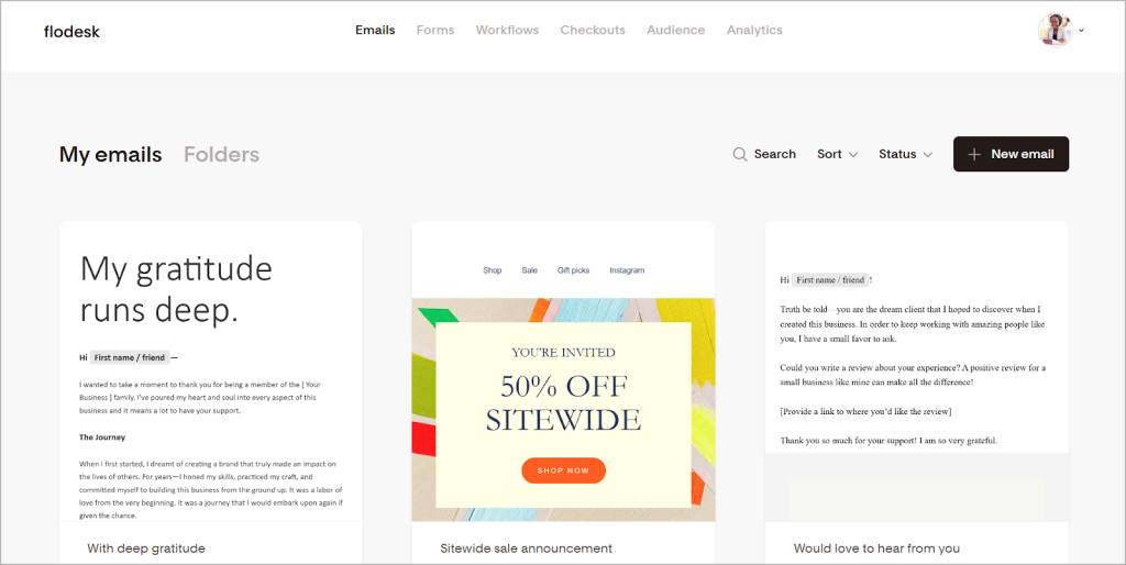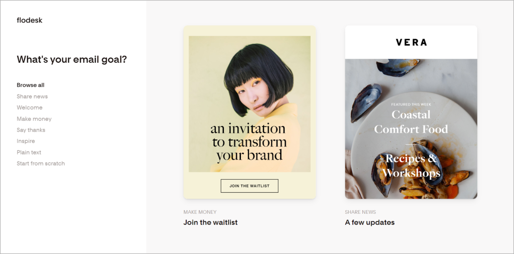 Flodesk makes this process simple and fast with its template library. You get access to 85 professionally designed, modern templates, neatly organized by use cases like welcome emails, thank-you notes, sales pitches, and announcements.