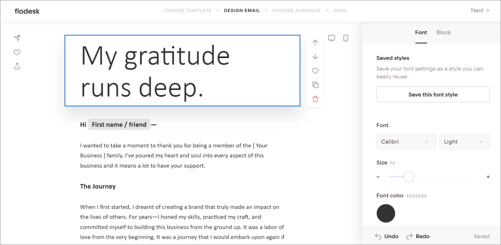If you’d rather start from a blank slate, Flodesk’s email editor makes it easy to build emails block by block.