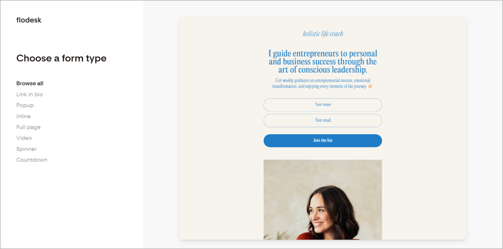 Flodesk’s Forms feature lets you create everything from inline and popup forms for your website to full-on “link in bio” pages (or more commonly, landing pages) for your social media accounts. These allow you to collect email subscribers to grow your list.