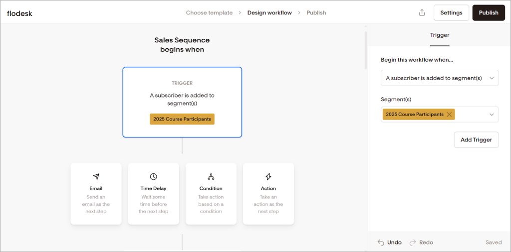 You can start with one of Flodesk’s nine customizable workflow templates or build your own from scratch using the visual automation builder.