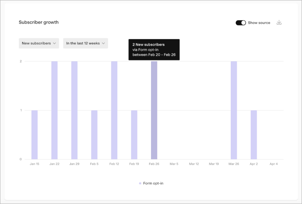 - Subscribers: See how your list is growing over time and identify your most engaged subscribers.